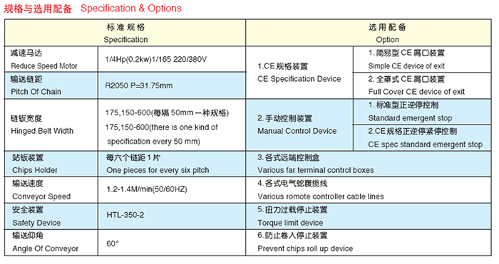 ●鏈板排屑機按鏈條節(jié)距區(qū)別有31.75,50.8,63.5,101.6幾種供選擇