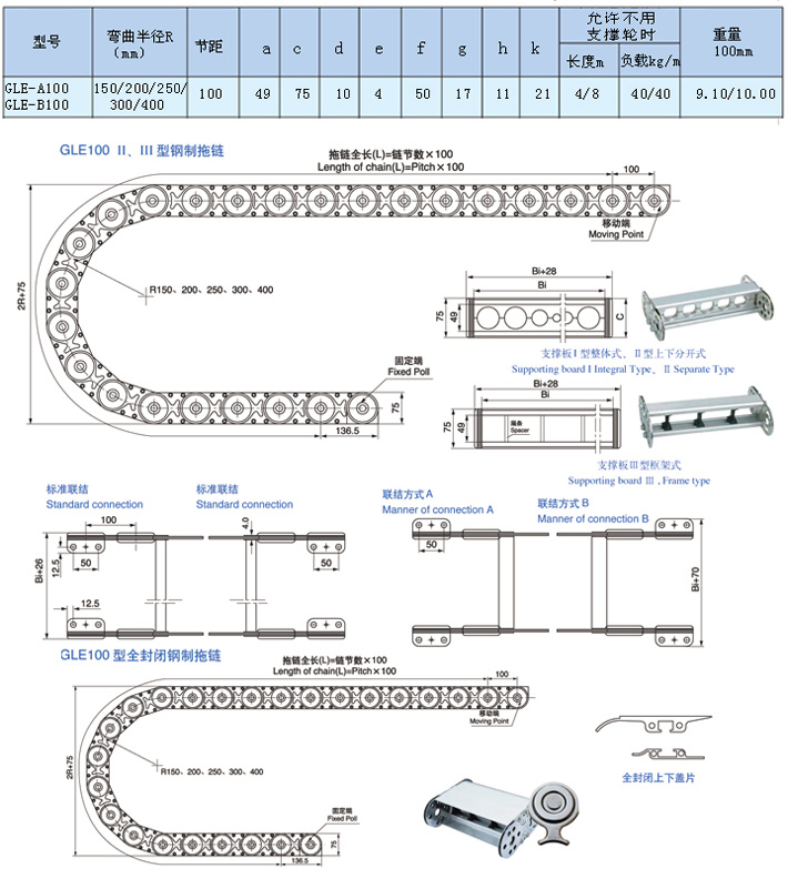 TLG100II打孔式鋼制拖鏈,節(jié)距100mm,彎曲半徑可分150/200/250/300,最小寬度60mm,最大孔距55mm。
