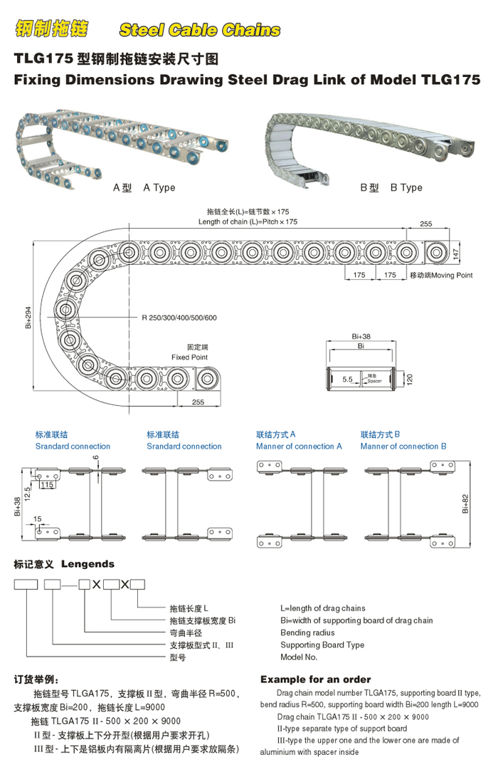 TLG175III新型電纜鋼制拖鏈一般應(yīng)用在機床機械等的電纜、油管、氣管、水管、風(fēng)管上,起牽引和保護作用。 按工藝分為鍍鋅、鍍鎳兩種。按支撐板形式分為整體式(打孔式)、上下分開式、框架式(隔離片式)。鋼制拖鏈可承載數(shù)量多,重量大的電纜及油管,自由懸置(允許不用支承輪)長度大,支撐板可依顧客需要制作,適用于工作母機,移動機械等。其彎曲半徑為50-600mm,鏈板高度為5-150mm。