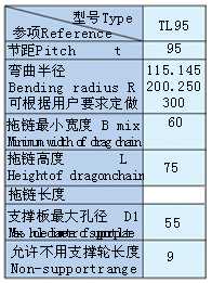 TL95III型鋼制拖鏈:簡介:節(jié)距95mm,彎曲半徑有115,125,145,200,250,300.鏈板高度70mm,拖鏈最小寬度60mm.內(nèi)高45mm