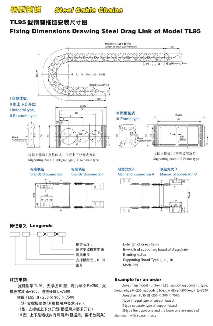 拖鏈型號TL95,支撐板Ⅲ型,彎曲半徑R=250,支撐板寬度Bi=300,拖鏈長度L=7500 拖鏈TL95Ⅲ-R250×300×7500