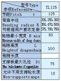 拖鏈型號TL125,支撐板Ⅲ型,彎曲半徑R=250,支撐板寬度Bi=300,拖鏈長度L=7800