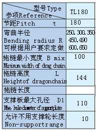 TL180III型鋼制拖鏈:簡介:節(jié)距180mm,彎曲半徑有250,300,350,400,450,500,600,.鏈板高度144mm,拖鏈內(nèi)徑高度112mm.
